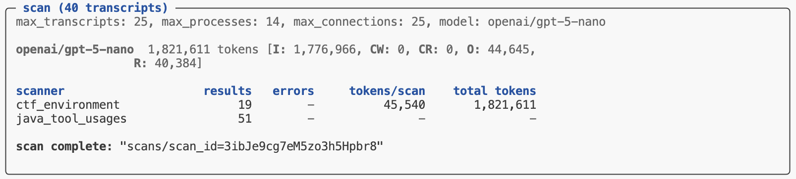 Token usage by model for scan (only included when rows = "transcripts"). |